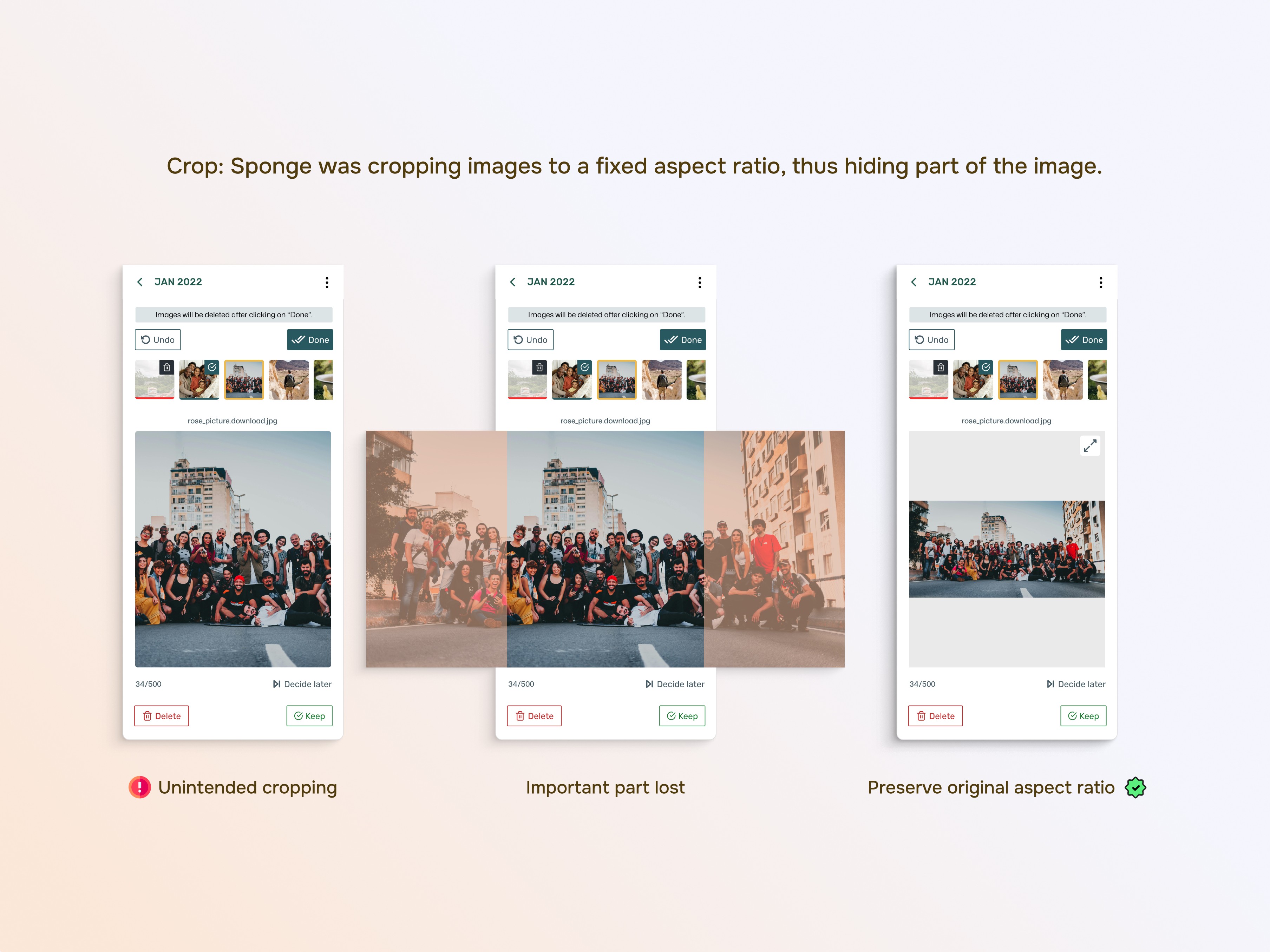 Sponge crops images to a fixed ratio, thus hiding part of the image. Preserve Original Aspect Ratio: To enhance user clarity, displaying pictures in their original aspect ratio is recommended.