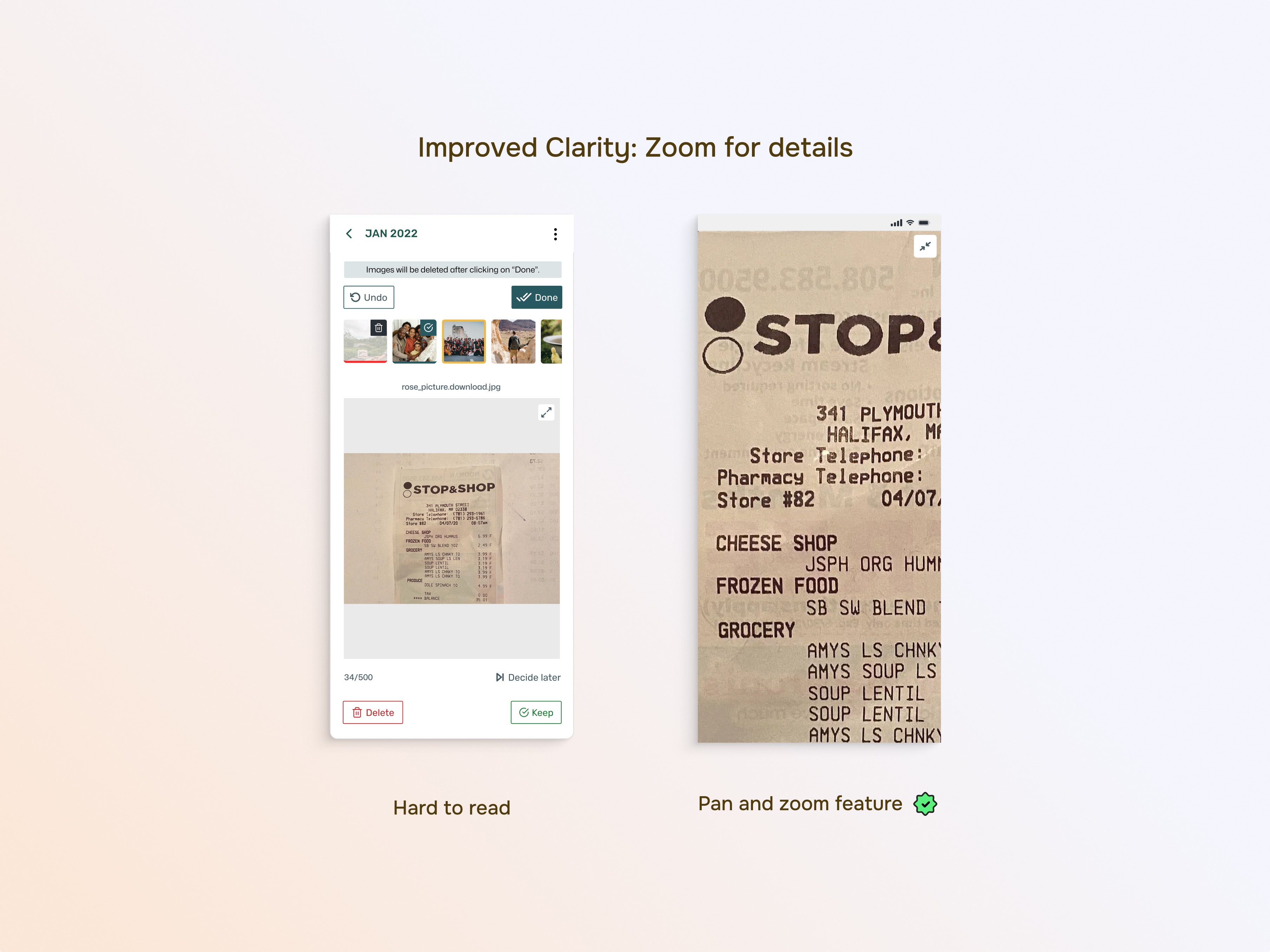Users recommend adding a zoom feature during deletion to better assess images, especially when text is present.